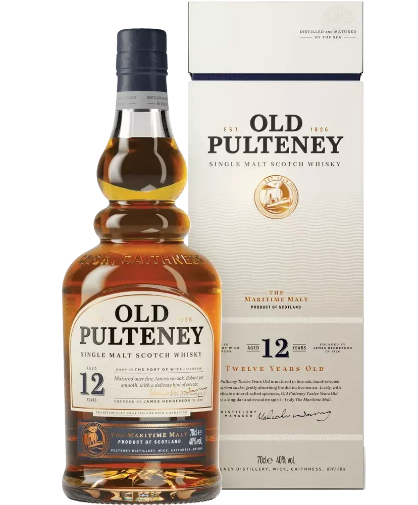 Old Pulteney 12YO to klasyczna szkocka whisky single malt, znana jako „Maritime Malt” – dzięki wyjątkowemu nadmorskiemu charakterowi. Powstaje w jednej z najbardziej na północ położonych destylarni na lądzie stałym Szkocji – w Wick. Dojrzewa w beczkach po bourbonie z amerykańskiego dębu, co nadaje jej łagodny, ale wyraźnie złożony profil smakowy.